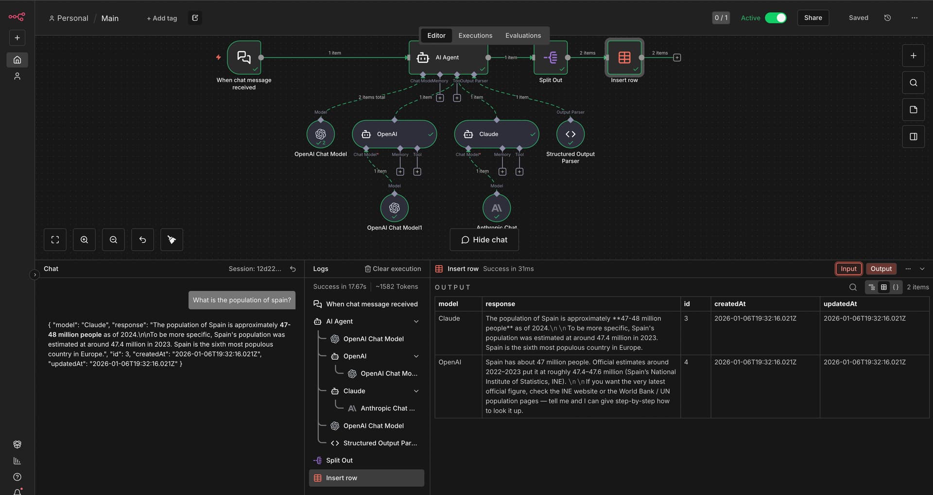 How can I iterate over multiple models in n8n? For example, I have 4 models and I want to loop through them to get their different responses. I also want to extract the name of each model and save the results (model name + response) into a data table.