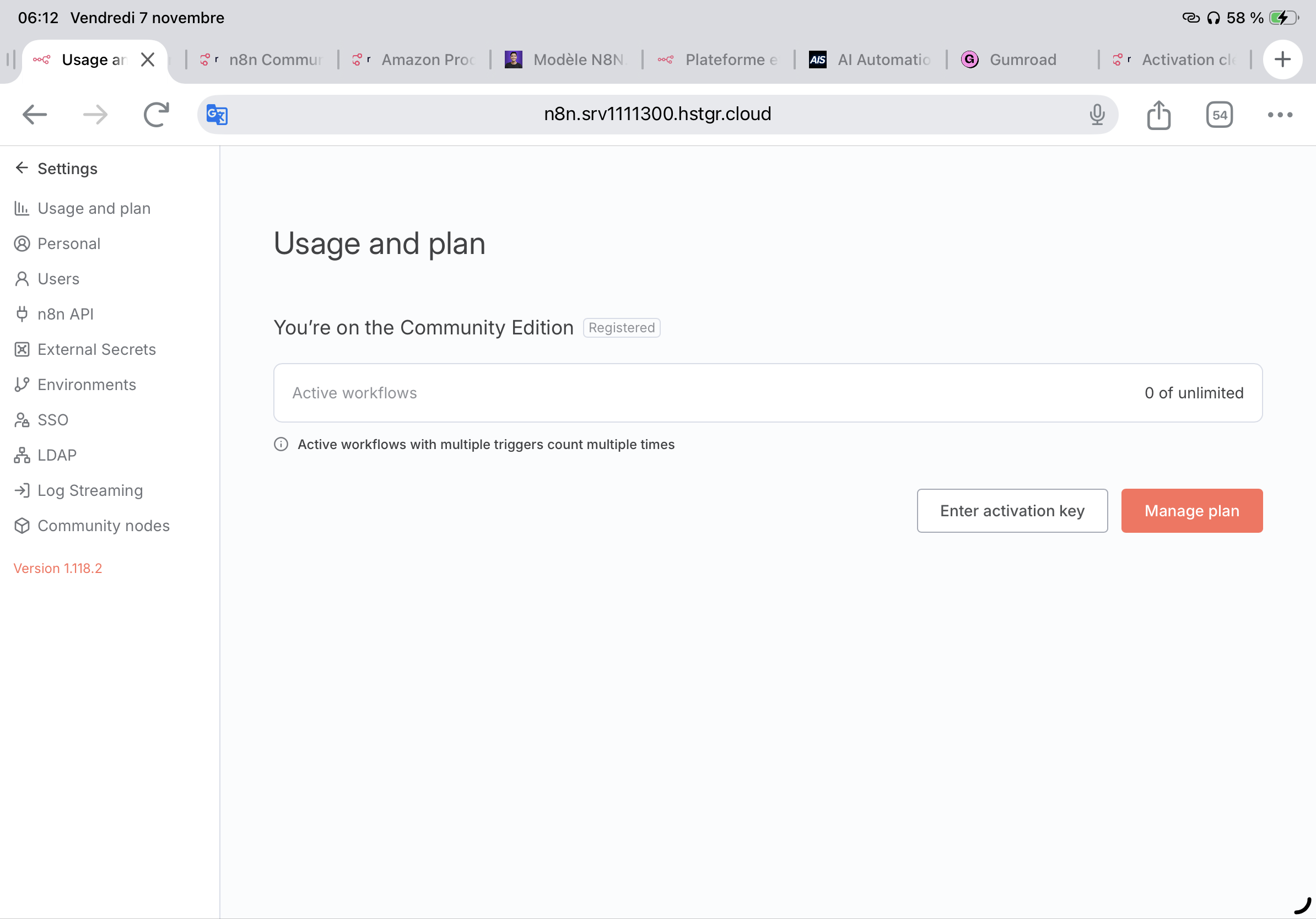 Je viens de m’inscrire via un VPS Hostinger, j’ai reçu la clé de licence n8n pour activer certaines fonctionnalités mais j’ai un message d’erreur « Cette clé d’activation a déjà été utilisée pour cette instance » sachant que j’ai fait plusieurs essais et que le 1er message disait déjà qu’il y’avait une erreur…