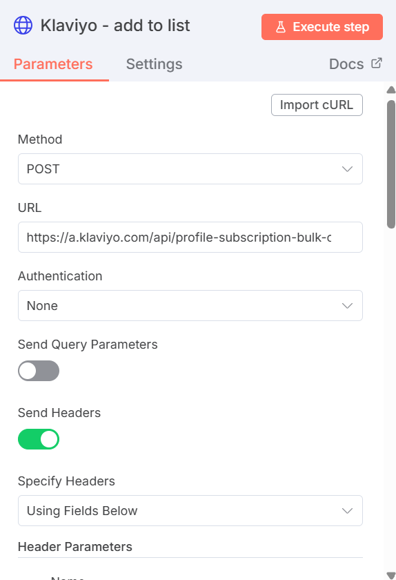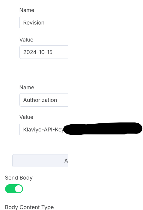Missing Authorization Header: Your screenshot shows “Authentication: None” which won’t work. Klaviyo requires API key authentication.