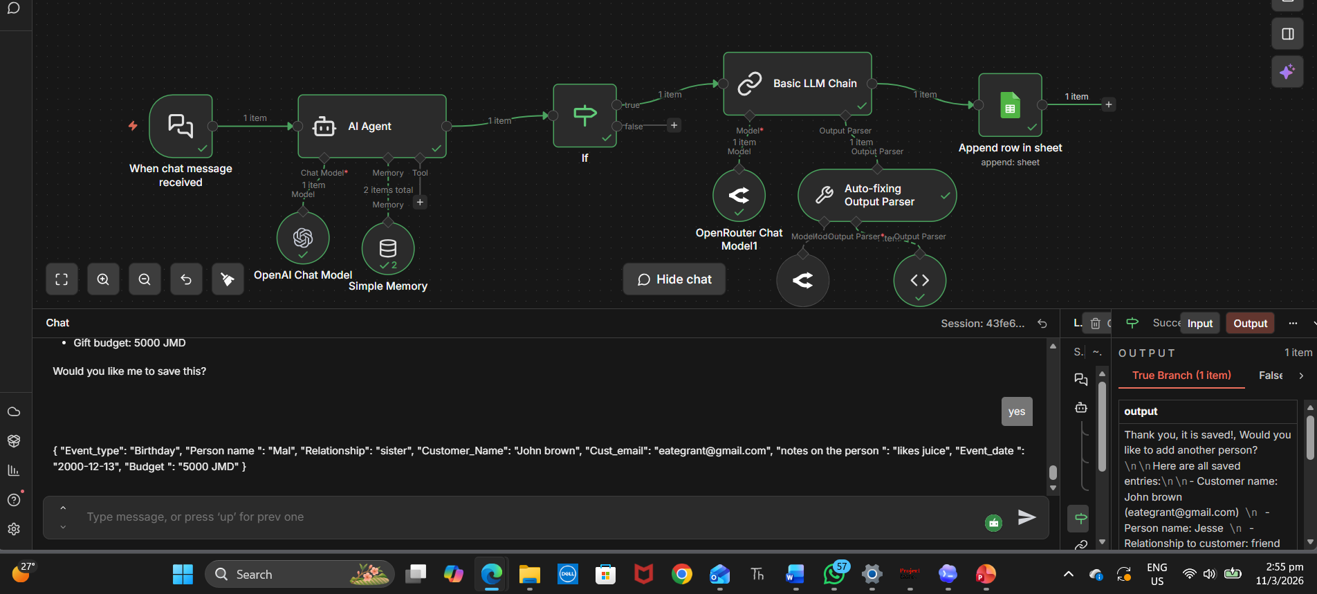 I think your trigger node is on default mode, which returns data from the last node in the canvas, instead of the AI output. Switch to ‘Using Response Nodes’ mode and attach a Chat node at the end.