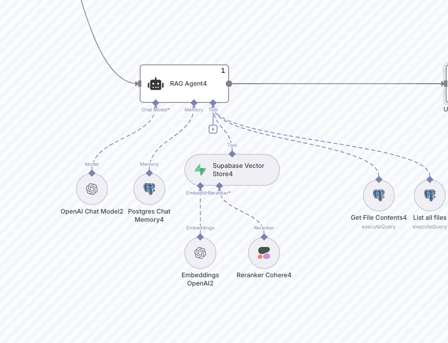 Hi everyone, I’m working on building an agentic RAG agent that retrieves data from a Supabase table where we store all our documents. The workflow then uses a Cohere reranker node to select the top 3 most relevant results before answering the user’s question.