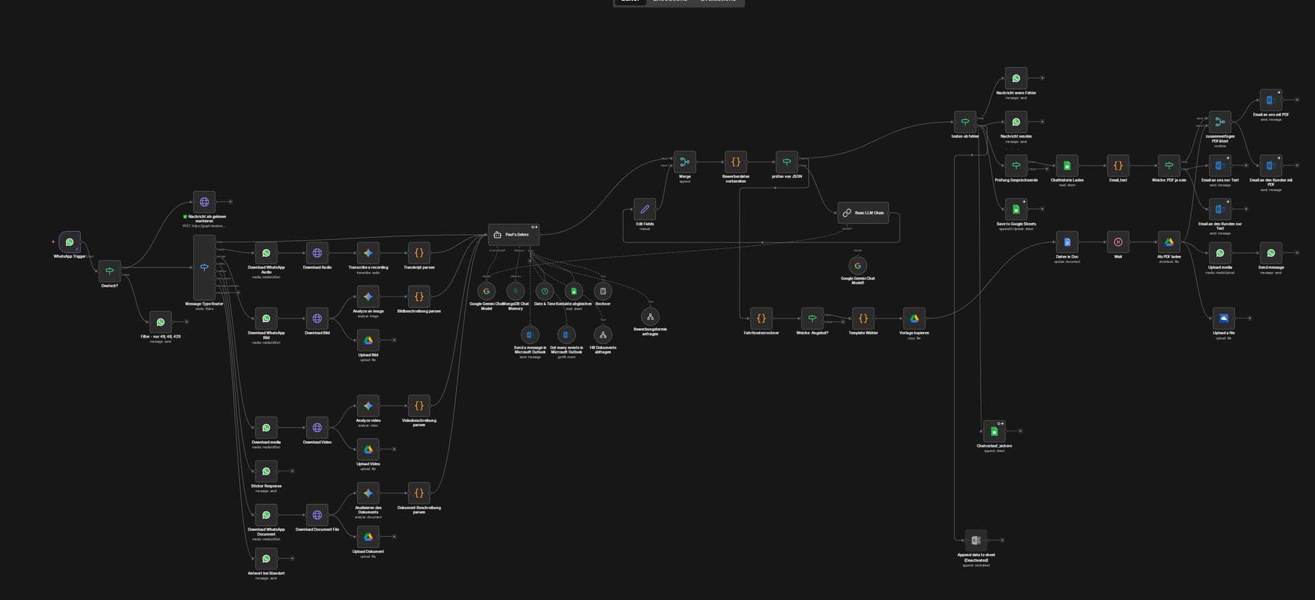 Main Workflow: AI Agent (WhatsApp bot for a roofing company) → Tool: Subworkflow for booking.