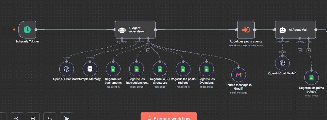 - AI Superviseur (Main WF): Reads the validation score and decides if an email (for manual approval) is sent to the director.