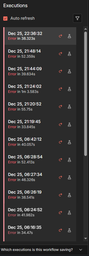 In many executions, the UI shows “connection lost” while the AI Agent node is running. The workflow does not crash immediately, but eventually fails after a minute and something.