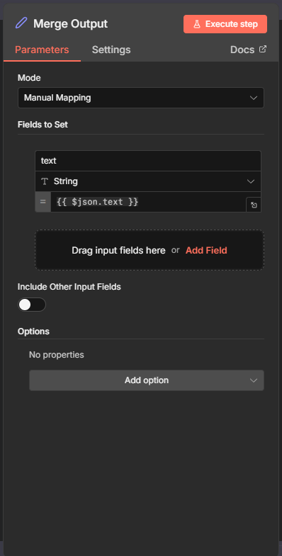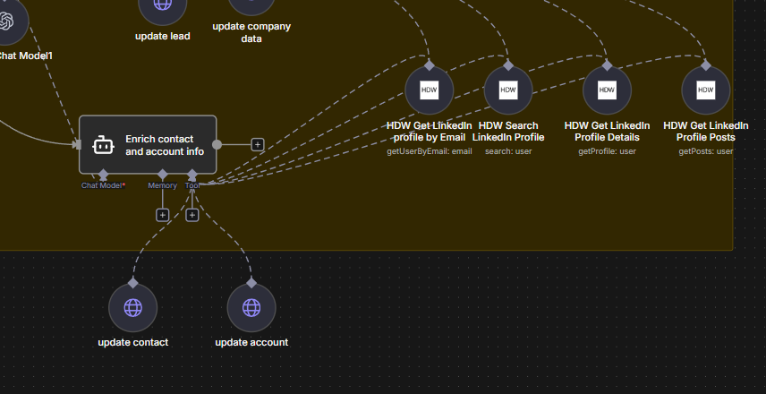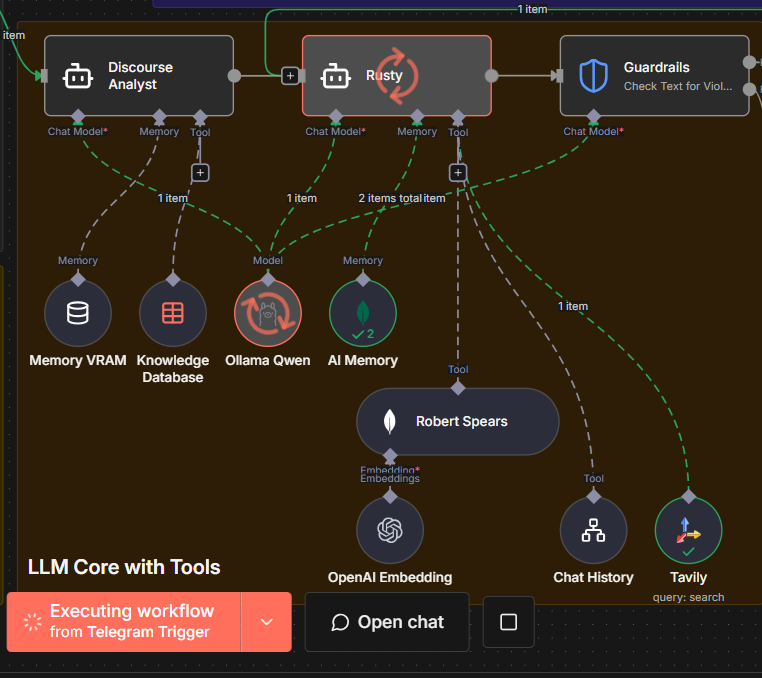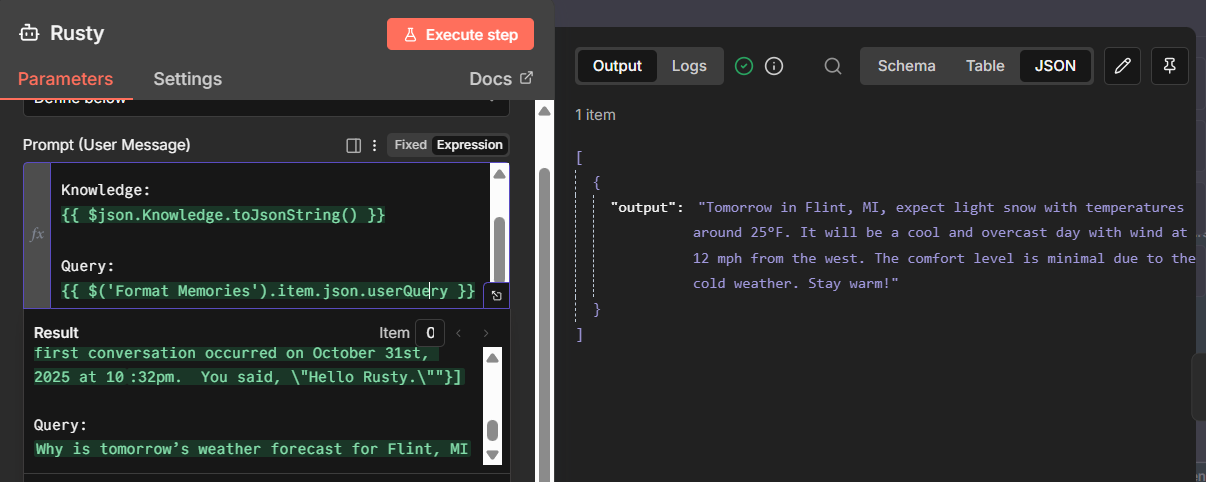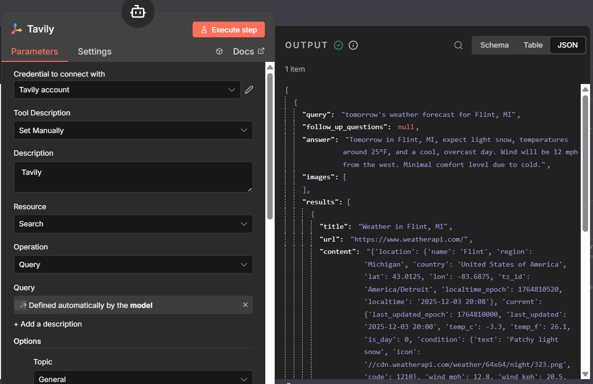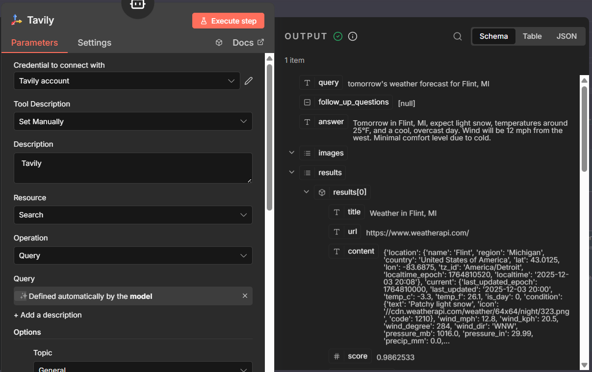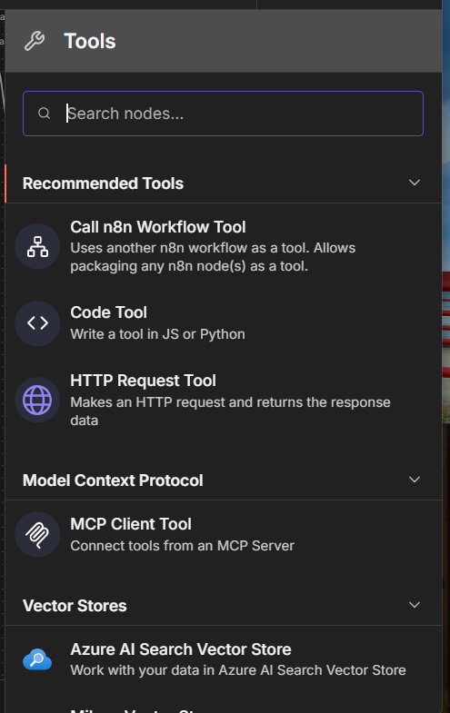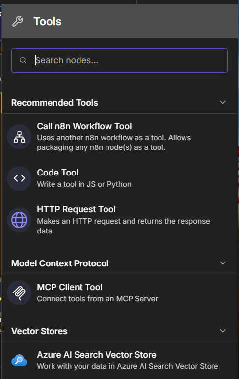 Here’s an example of one of my chat agents, pulled from the same example I used above. In this case, I’m evoking Tavily, for Internet pulls. Here’s what I would do: Set the workflow to inactive, and trigger the workflow, give it an input that would call the tool. In my case, I asked it for tomorrow’s weather forecast. Let the workflow execute. Once it completes, double click the tool node, and look at the log. I’ve included snippets of what I see in Schema and JSON. You can see what query was sent to the tool, usually TEXT, and how it responded. The Logs will also include error messages, if any. If you do not see this, it’s an issue with the tool node, and if it wasn’t written by you (in most cases, not) you will need to reach out to the Dev Team that supports that tool. Remember, all tools are just HTTP Requests with an API call, that’s been wrapped up in a nice package. If you understand the HTTP Request Node, you should be able to write your own tool. Click on Tool in the AI Agent, and you should see the available options shown in my last screen snippet.