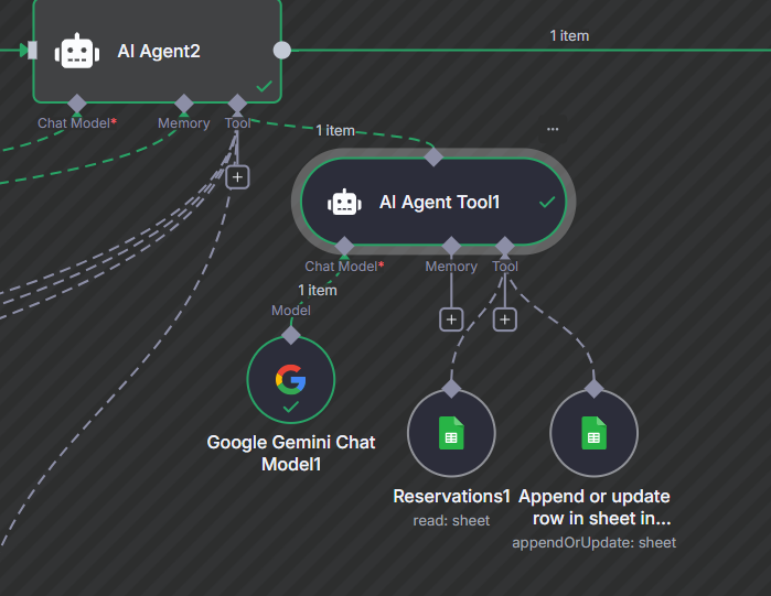 I think, instead of adding the ai agent tool1 to the reservation related system message after the ai agent2 node, you should add the google sheet node to add or update the node after that.