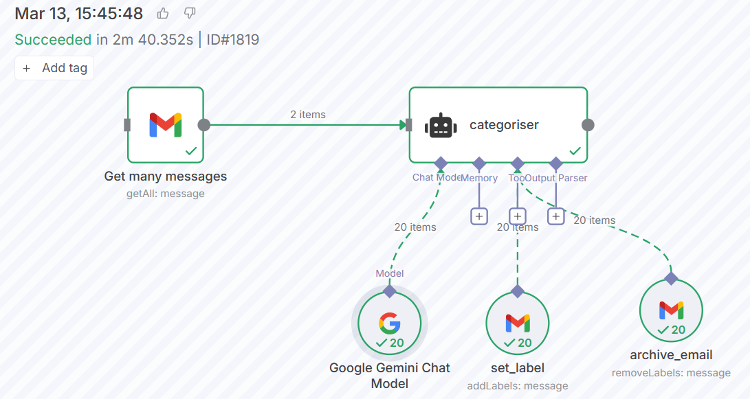My agent is designed to add a label (set_label tool) to each email it receives and then remove the email from the inbox (archive_email tool). But for each email that the agent was given, it executed each tool 10 times. The problem was, the agent repeated each tool because it did not understand it was successful.