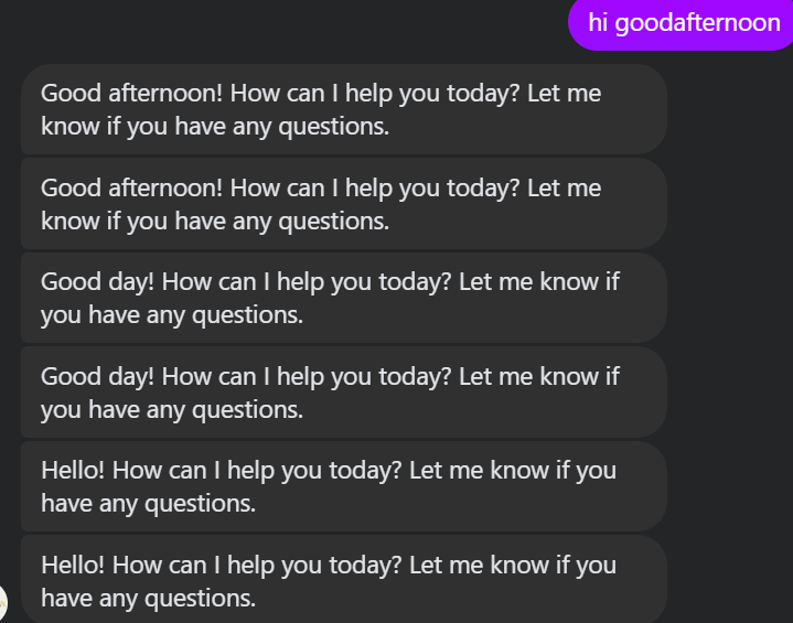it doesnt work, i dont understand the 2nd and 3rd fix im sorry, right now the ai will understand my message and reply to it accordingly, then few seconds later it will spam a greeting message, i think the ai is talking to itself it sees the reply to itself