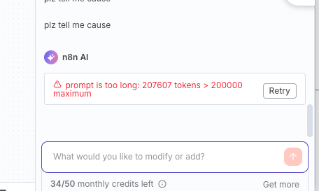 It happens, but sort of rare. I’ve had it happen twice with just simple workflows. It thinks for a while, tries and validate a few workflows, then just errors out. I would just close the editor (after saving any changes), then come back and have it try again. This usually does the trick for me. There’s a similar question to this: Prompt is too long: 203416 tokens > 200000 maximum - #6 by KhemOptimal