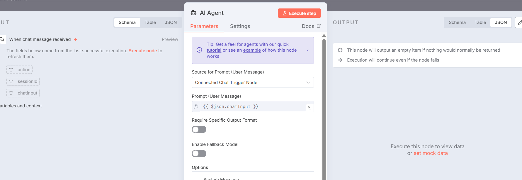 in fact, even though the chat is working, the Workflow is still empty (no green/success connection between the nodes) so it does not allow me to check the logs and so on, as per screenshot (empty workflow) do you happen to know why? and how i can show the logs?