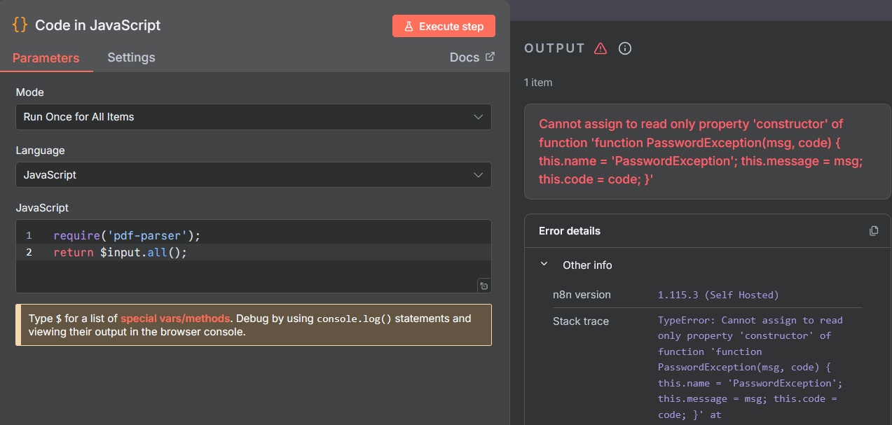 It is clear that the npm package gets recognized, because you can see it in the stack trace. Another type of error I get is with pdf-parser.