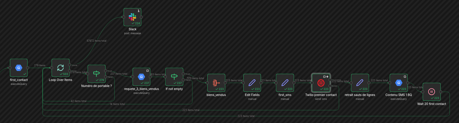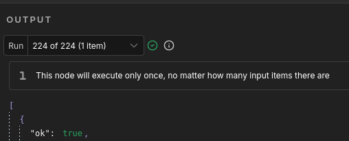 In my example, the final Slack node is triggered 224 times with a total of 87472 items and I don’t know where the 87472 come from. The Slack node has the Execute once option checked.