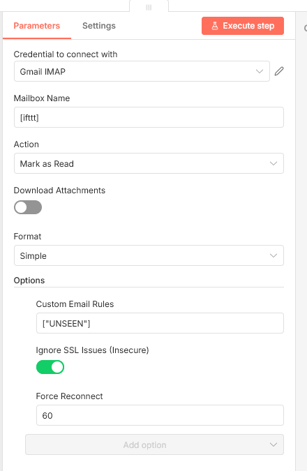 - Make sure the Email Trigger (IMAP) node is still the first node in the workflow.