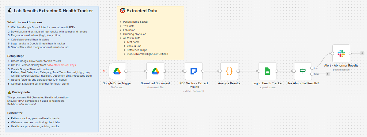 Lab PDF dropped in Google Drive → extracts all test results with values and reference ranges → flags abnormal values → calculates overall status → logs to health tracker → fires Slack alert if any abnormal results found