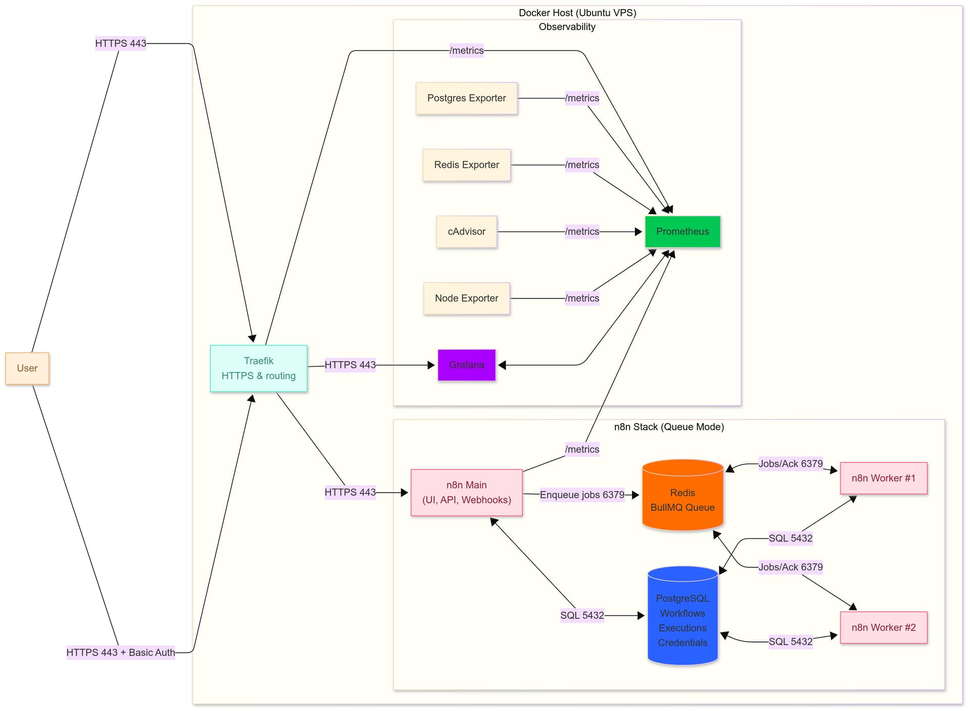 n8n Monitoring with Prometheus & Grafana on Docker Compose (Traefik, Exporters) — with One-Script Automation: n8n Monitoring with Prometheus & Grafana (Docker Compose)