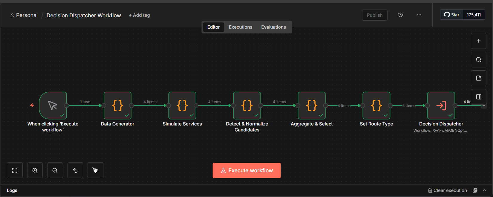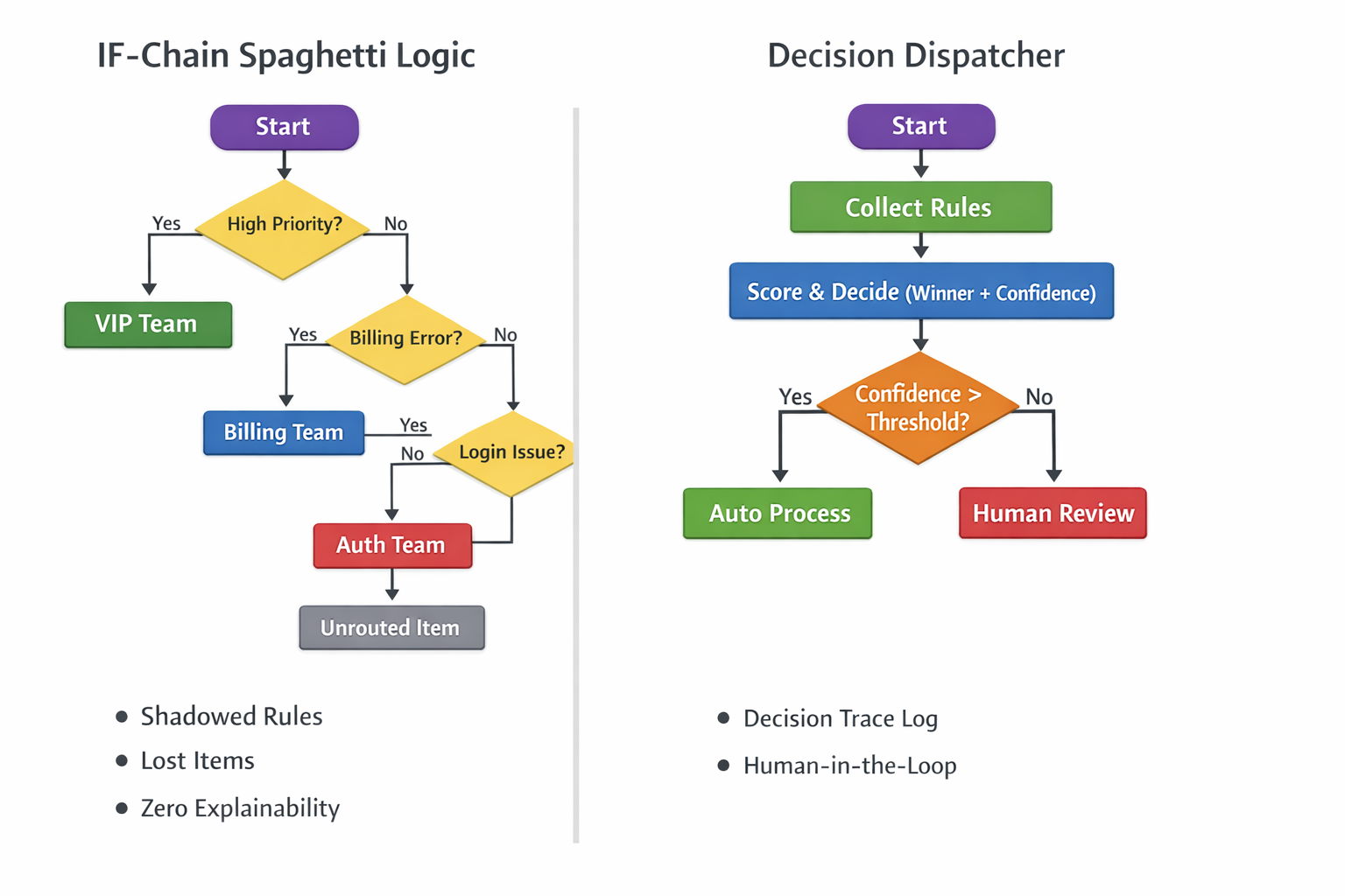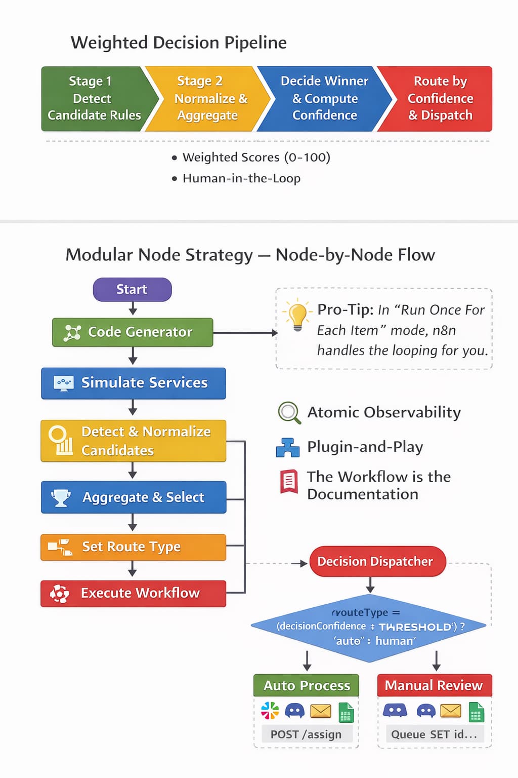 The Decision Dispatcher workflow solves this by transforming binary Yes/No logic into a weighted decision pipeline. Instead of just picking a top-scoring rule, we calculate decisionConfidence, record decisionTrace, and route low-confidence items for human review.