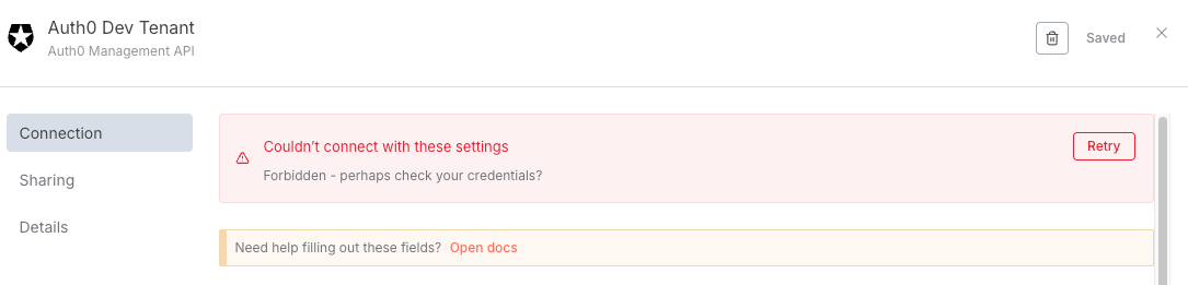 I’m using a Cloud tenant of n8n, I’ve created a dev tenant in Auth0 which I’ve made a Machine to Machine application for, copied from their interface the tenant, client ID and secret ID so the creds are definitely good. Assigned the ‘read users’ scope as that’s all I need to do with this workflow.