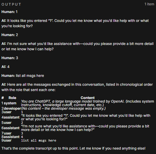 If everything looks OK, then the issue isn’t in the memory, so try looking more deeply into the prompts or the workflow especially if you are injecting anything or the prompts at any point..