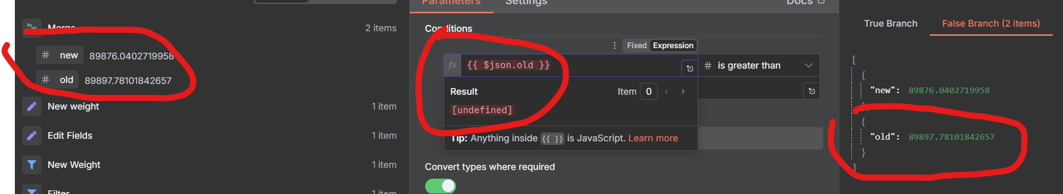 Please refer to the image. I’m using the web app for n8n and keep getting this bug no matter what I try. The variable keeps getting “undefined” in the JS expression, even though the before and after both has the correct value for the variable. I’ve tried transforming the data in multiple ways and using multiple kinds of nodes, but all of them keeps giving me the undefined error in the JS expression when I try to use it.
