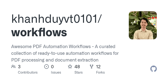 Full workflow collection: GitHub - khanhduyvt0101/workflows: Awesome PDF Automation Workflows - A curated collection of ready-to-use automation workflows for PDF processing and document extraction · GitHub