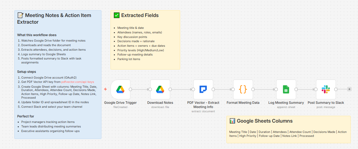 New file in Google Drive → downloads document → extracts all meeting data → logs to tracker sheet → posts formatted summary to Slack with tasks, owners, and due dates