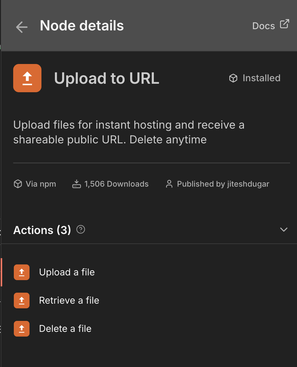 I built Upload to URL - a community node that gives you a public URL immediately, and lets you set an expiry date so the file self-destructs when you no longer need it.