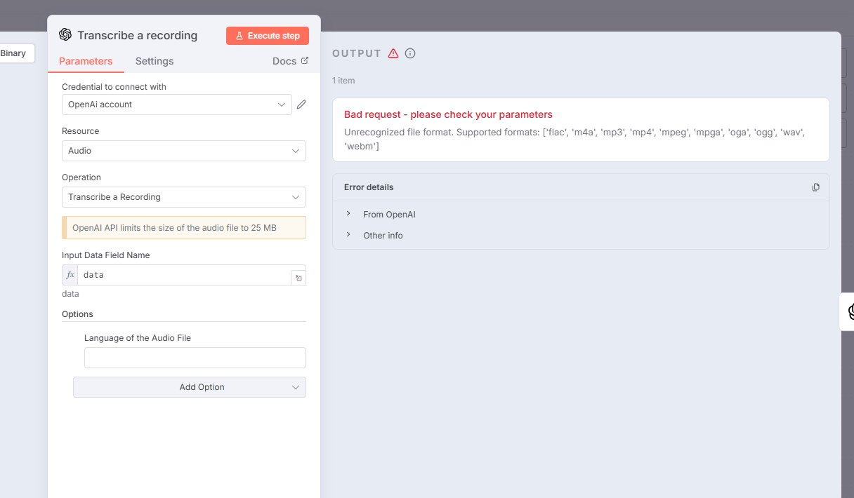 If they really don’t support the format I would try to get the recordings in a different format (eg. mp3) from the tool where you get the files from. If that is not an option you will probably need to transform the files with a command line tool like https://www.ffmpeg.org/ which can also be done on n8n if you’re using the self hosted version.