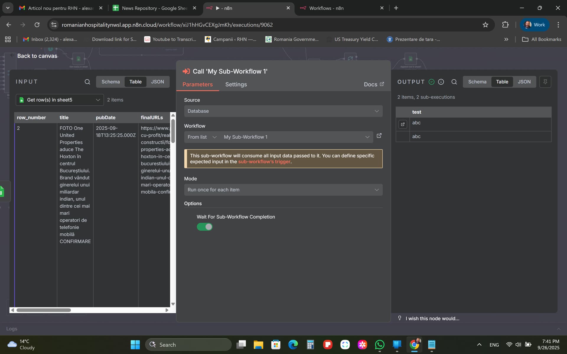 when i execute the parent node that launches the sub-workflow it first displays a Waiting for input message in the output window. The suppose i have launched subworkflows for each of the 2 items i had in the parent node on the input side. After i complete the form for the first item the output window of the execute workflow node changes to displaying the entire input window showing both items that were in the input window (on top of the table it says 2 items, 2 sub-executions), when in fact it should have waited for the second item subworkflow to be completed (it should maybe have reported 2 items, 1 sub-execution). Now i completed the secodn subworkflow and looked back into the output window of the parent node and nothing changes there still on top of the table in the output it says 2 items, 2 sub-executions.