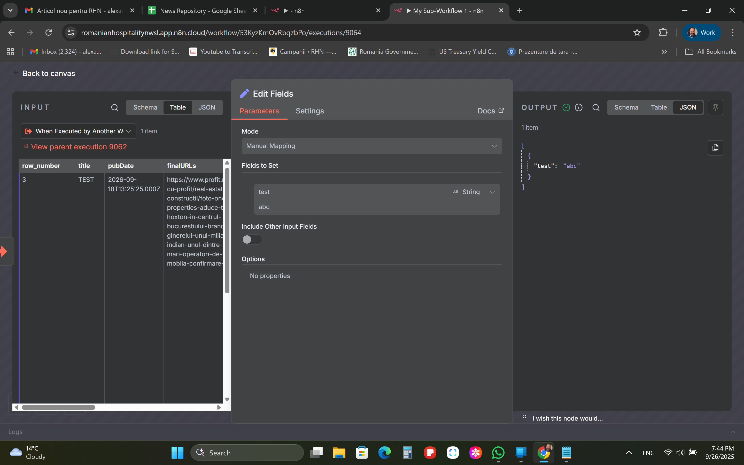 In your main subworkflow’s Set node, make sure you are not just passing through the input, but are explicitly setting the output fields. For example, if you want to output { “Prompt”: “asta e al doilea” }, configure the Set node to only output this field and do not keep any input fields.
