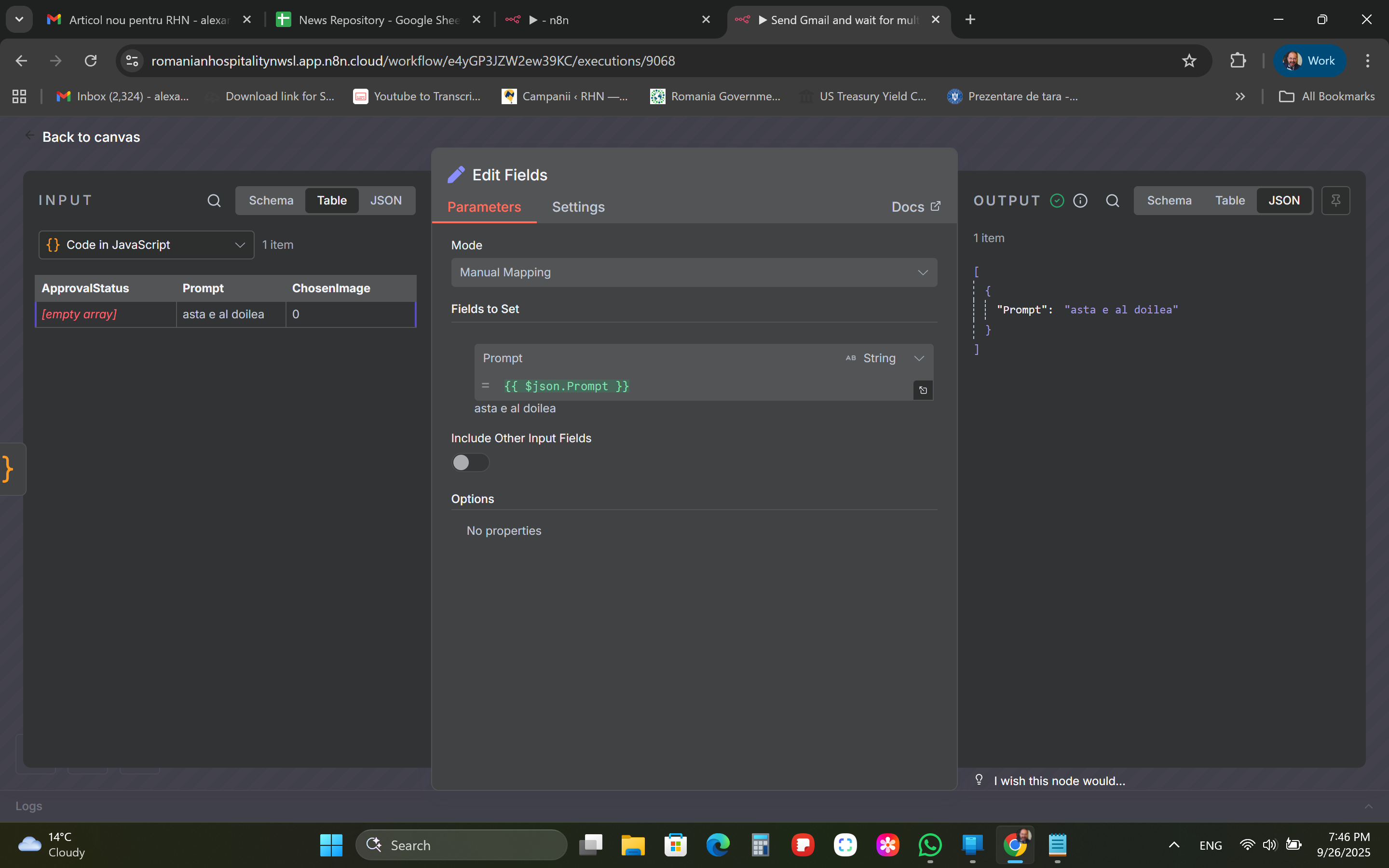 Make sure the Set node is using the correct fields from the output of the “Send Gmail and wait” node (for example, using {{$json[“Prompt”]}} if “Prompt” is the field returned).