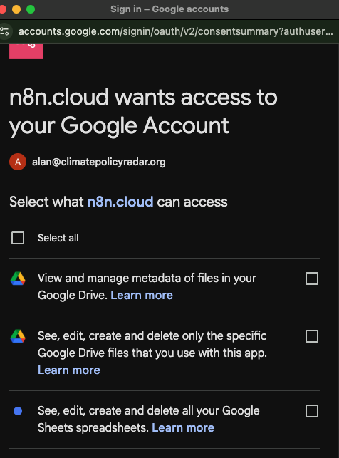 I do not want to grant N8N permission to every google sheet I have. So I selected only the second of the three sheets permissions (“See, edit, create and delete only the specific file”). However, I cannot seem to get N8N to detect the sheet. This is the URL of the sheet I want to add: https://docs.google.com/spreadsheets/d/1dg6sp_n713IQ0GZiMKHVVzYvev9XN3FXvRU5OM0_4AY/edit?gid=0#gid=0