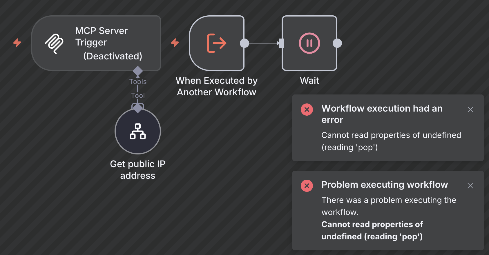 Hello I’m getting **“**Cannot read properties of undefined (reading ‘pop’)” error when triggering subworkflow from main workflow using MCP trigger. This error is returned in the main workflow execution, where there is no execution logs and the MCP server trigger is marked deactivated after execution, but the subworkflow is successfully executed without error.