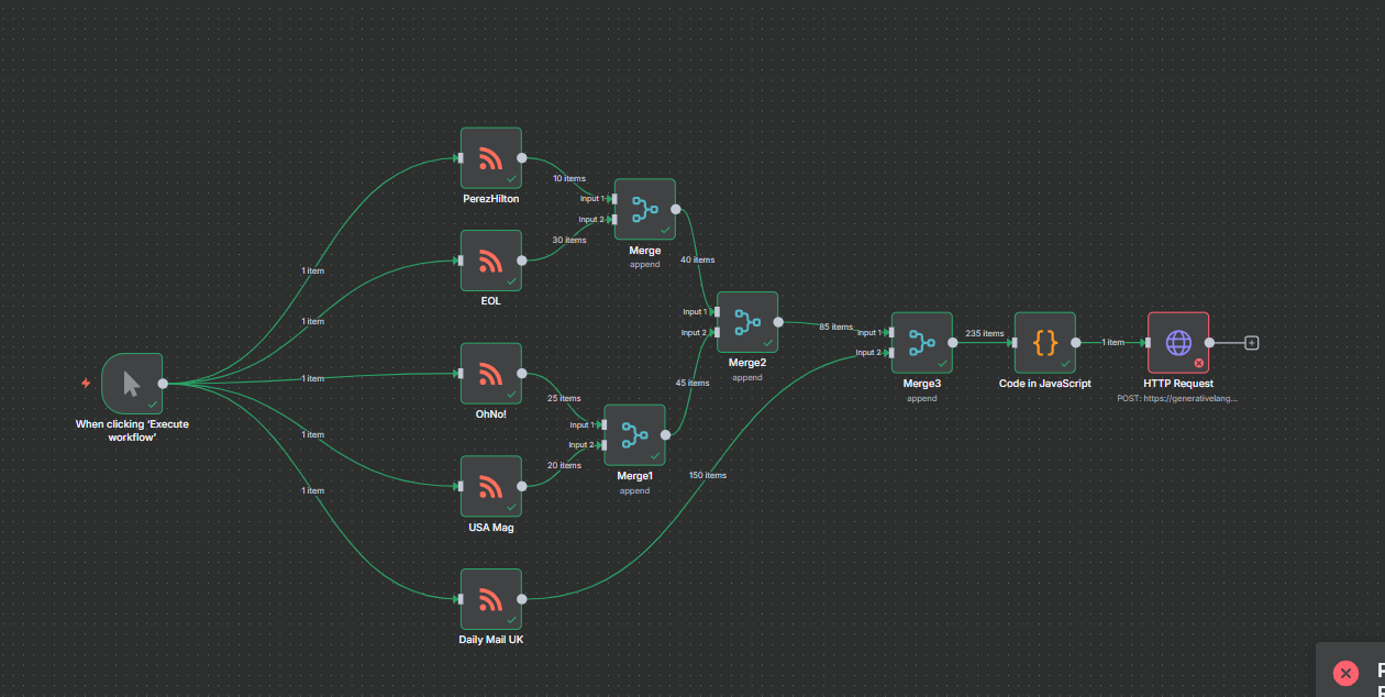 I am building this workflow for the past 3 days, I am a beginner, dont know how to code. The idea is to get latest blog posts from 5 websites and use that content to generate an email using Gemini.