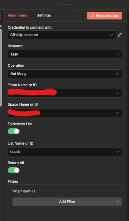Looking at your screenshot, I can see you’re trying to use ClickUp’s “Get Many” operation to retrieve tasks from a “Leads” list. The issue you’re experiencing (no output data) is likely due to how the “Return All” toggle works with filters.