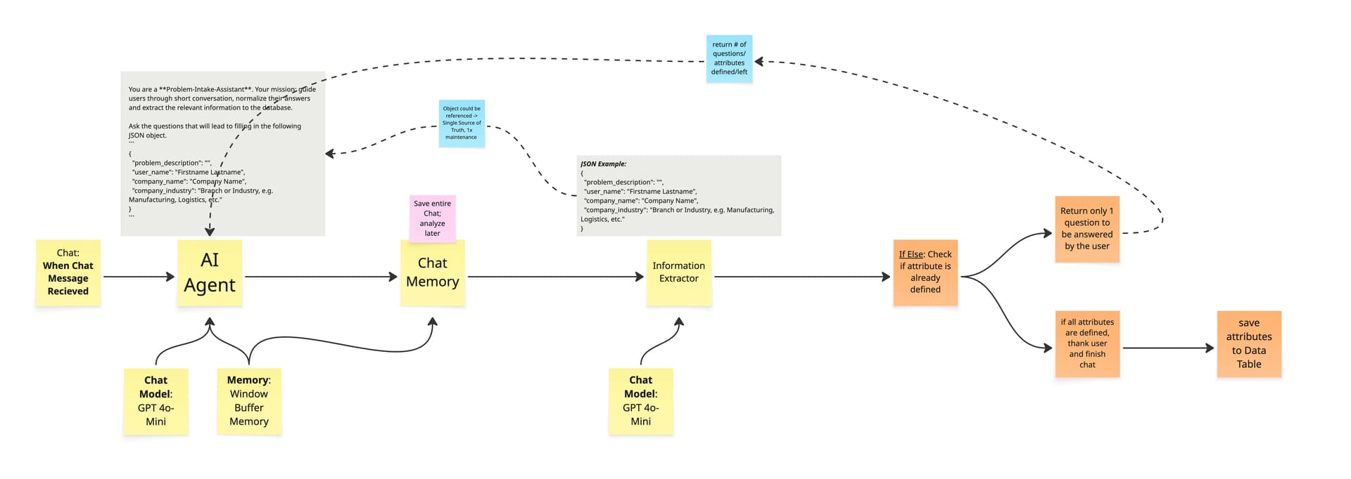 I’ve broken it down to the MVP version (less attributes, n8n Chat instead of Webhook, n8n data table instead of proper DB etc.).