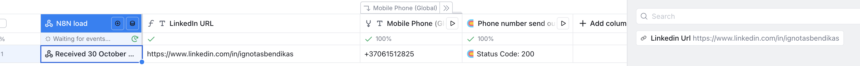 Hey! I am working on enrichment on demand workflow which after input on native n8n chat processes message, extracts linkedin URL from message, sends it to Clay table, in Clay table finds phone number, sends number back (or blank if not found) to n8n and then returns answer in the chat window.