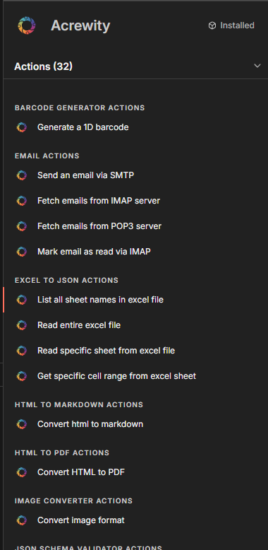 Acrewity is a small collection of general-purpose utility APIs built to support automation workflows. This node (@acrewity/n8n-nodes-acrewity) exposes those utilities directly inside n8n.