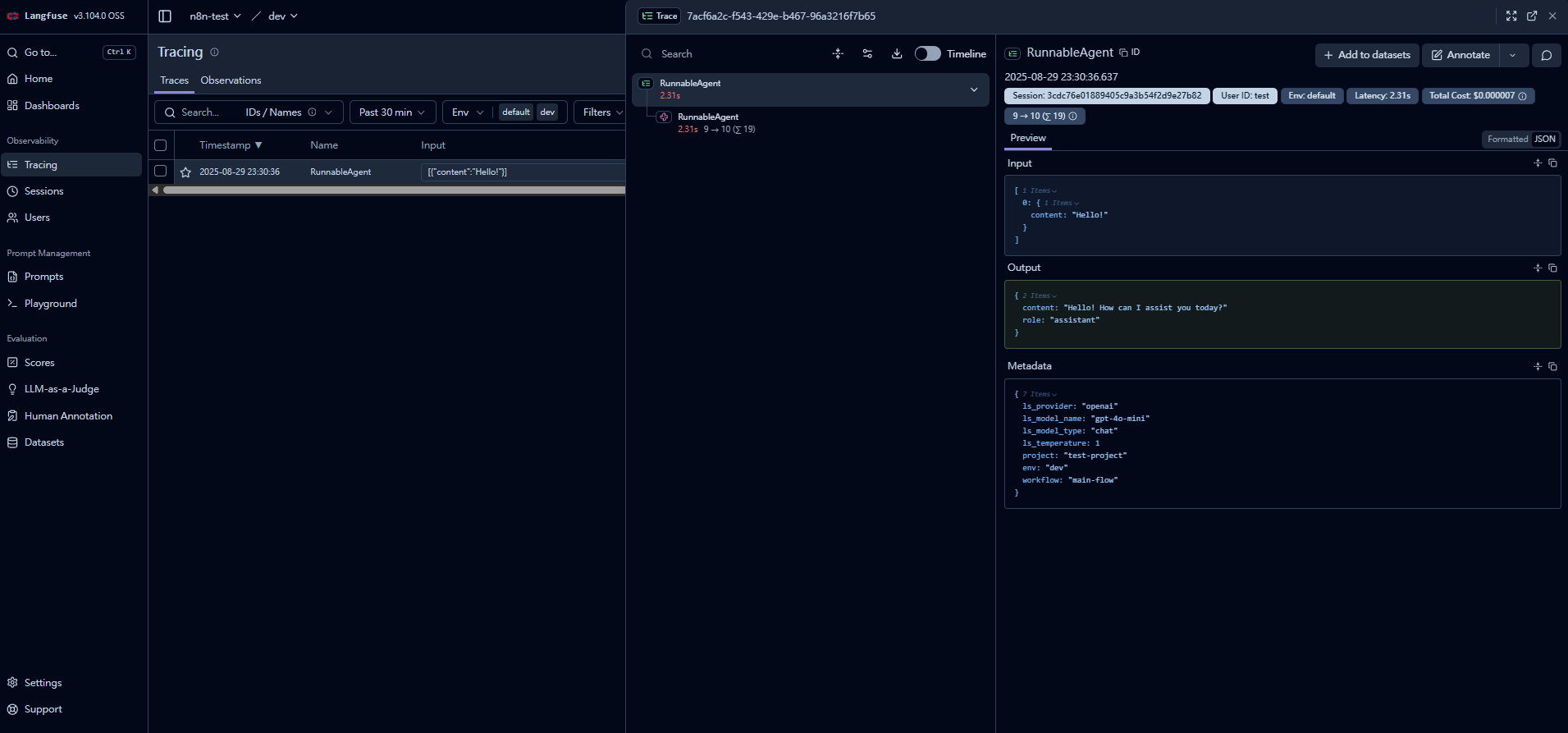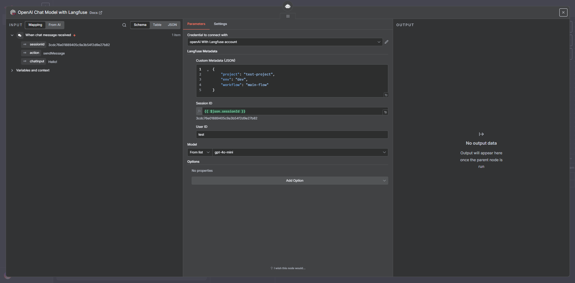 This node automatically injects Langfuse-compatible metadata into your OpenAI requests. You can trace every workflow run with context such as sessionId