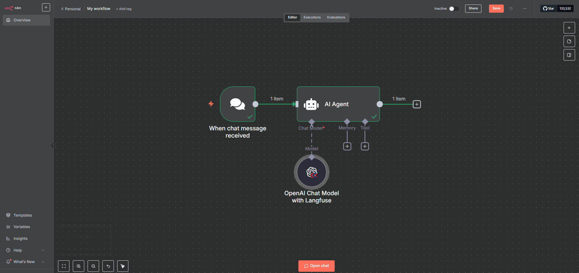 Here’s a typical workflow configuration using the Langfuse Chat Node: