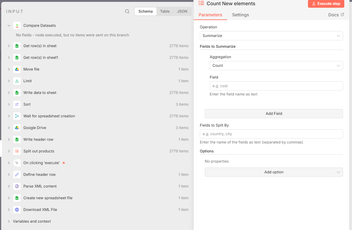 Instead, the “Count New elements” node receives no input, there is nothing I can drag and drop into the “Fields to summarize/Field” section, even when I connect the “In A only” output.