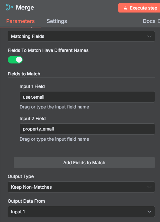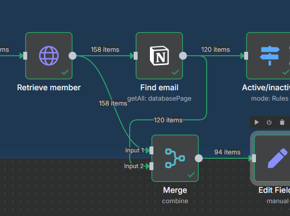 I tried multiple things such as merge node and compare datasets, but they never output 38 results as you’d expect. In the screenshot you can see the merge node outputs a total of 94 items, which also includes emails that DID get found in Notion, so it’s not accurate. The settings in the merge node seem logical to me… compare the email fields and keep the non-matches, but it doesn’t work as I’d expect.
