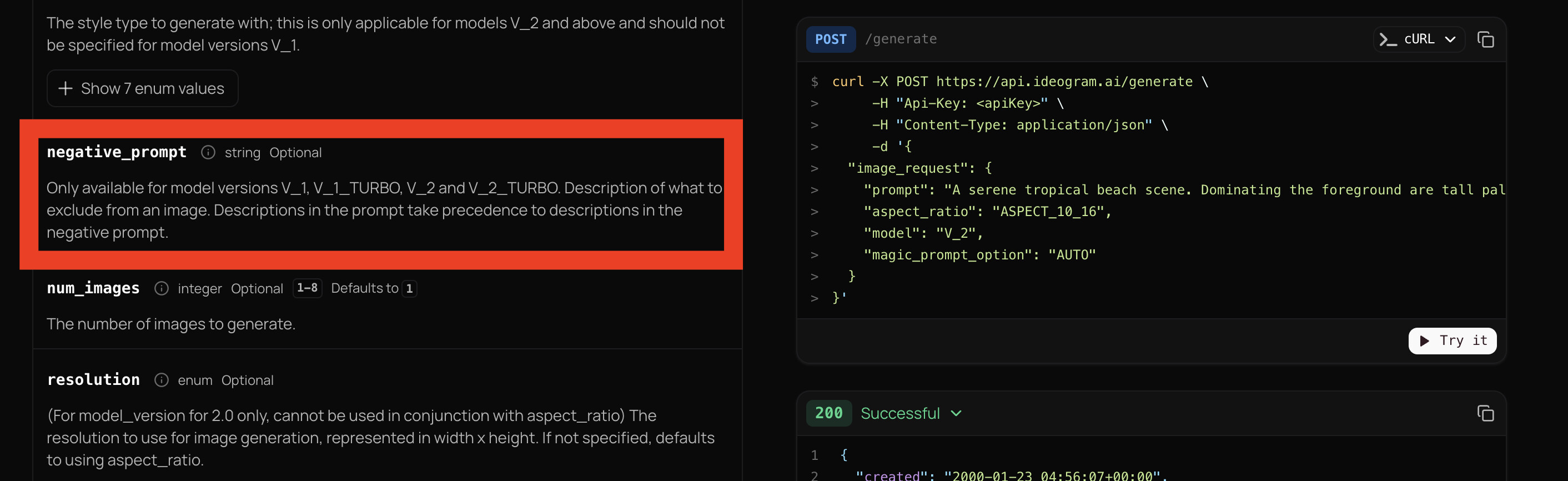It looks like you’re trying to use the model V_2A_TURBO which according to the documentation is not supported for negative prompts. Either take the negative prompt out, or change the model to V_2_TURBO and NOT V_2A_TURBO