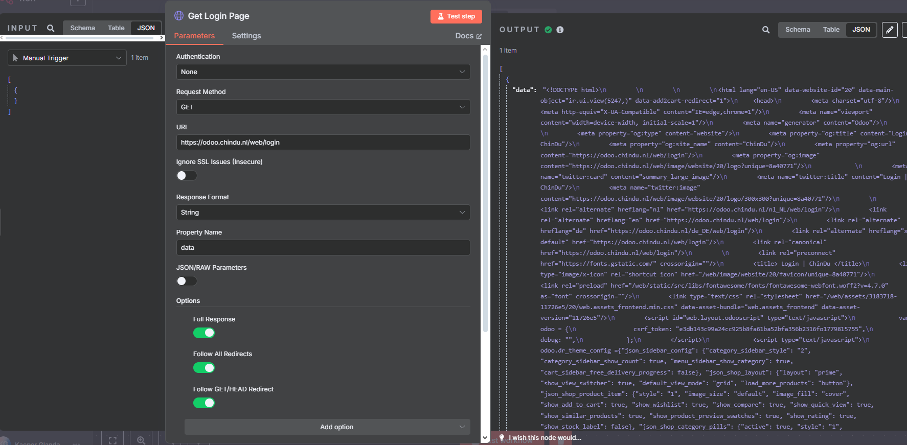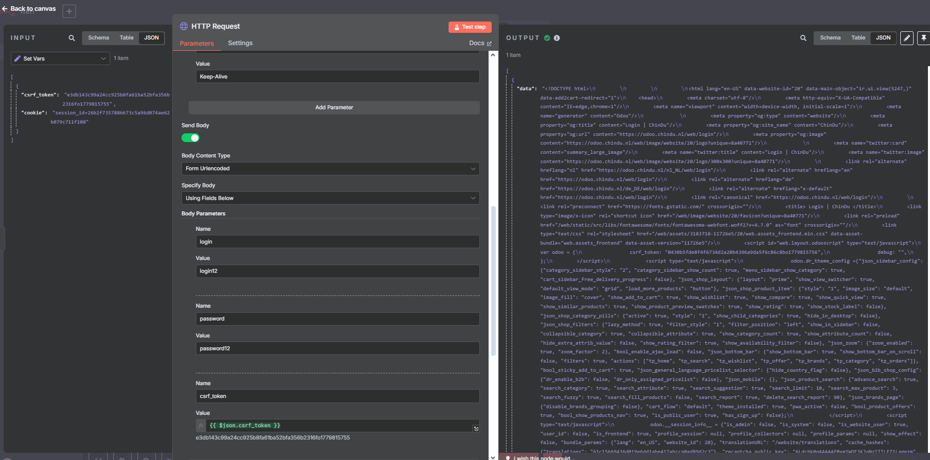 I’m trying to connect to Odoo using n8n, specifically via HTTP Request login/password, but something is not working, I would like to ask for help with this, I get the session id and csrf token using GET, but with POST it looks like it is not logging in correctly because it neither returns cookies nor redirects, even though I have set the redirect x times already, I am also sending the workflow(couldnt send it so showing GET and POST settings , maybe you will see where the error is or something similar