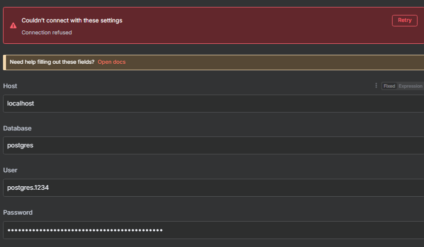 So the trick is to create the credentials for Postgres on n8n using port 6543 (for pooled transactional connections), and for the User field, you have to add both your username and tenant_id, joined with a “.”, like the example below: