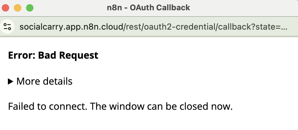 This appears under more details: {“error”:“redirect_uri_mismatch”,“error_description”:“Bad Request”}
