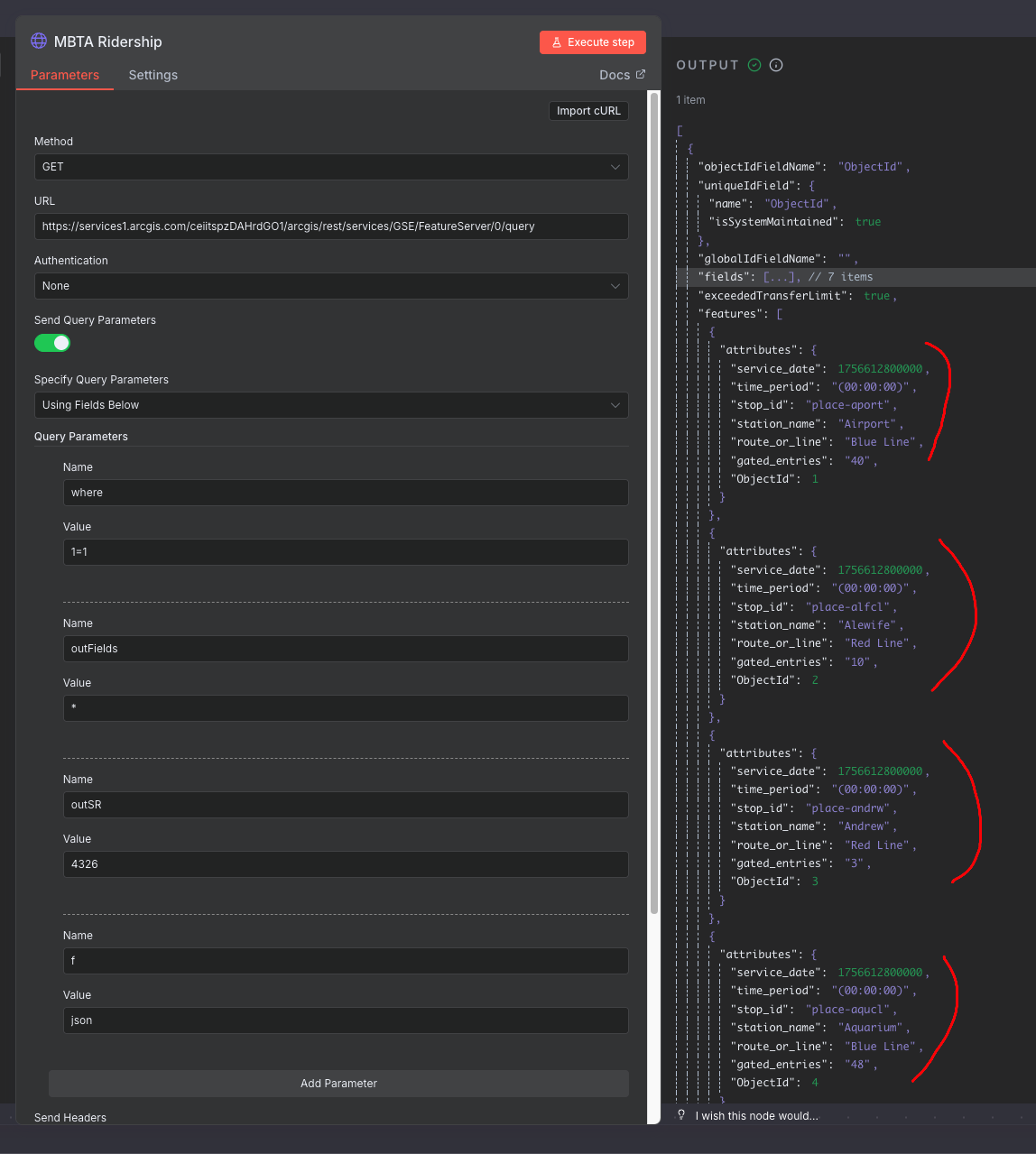 Hello, I am new to N8N and am using an HTTP call to access data from Boston’s MBTA and local weather data, but when the data comes in it isn’t in useful table format like it is in the original source. I have been trying to Set fields, split out, etc but have been unsuccessful. Does anyone know how to fix this? Code attached here.