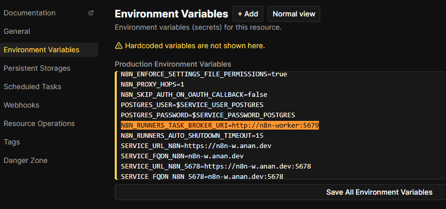 I deployed an n8n instance using Coolify “n8n-with-postgres-and-worker” pattern.
