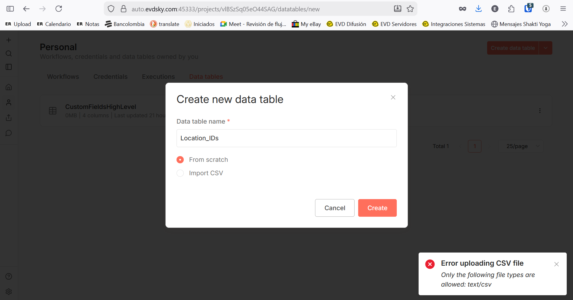 When i try to create a new data table using CSV import, it fails with a wrong file type error. CSV was created using Notepad++ (UTF8, Linux new line style). I tried exporting a CSV from a table created from scratch in n8n and importing it again, also didn’t work. Also created a CSV using LibreOffice, same thing.