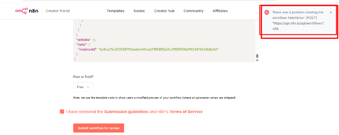 Error happens immediately on clicking “Submit”. Preview loads fine.