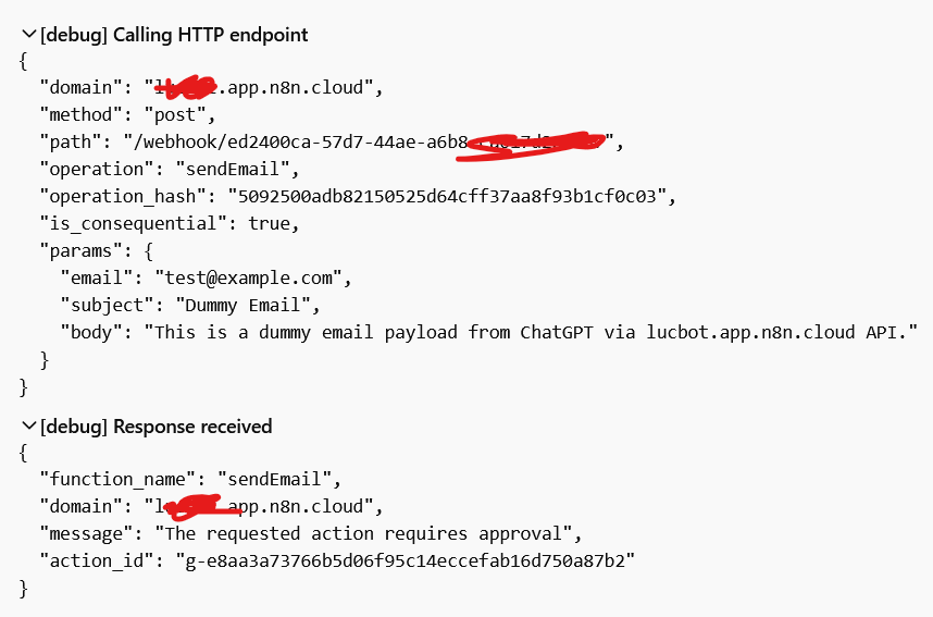 The “The requested action requires approval” message is totally the action verification method on ChatGPT side. It requires you to manually allow the action, usually with the button “Confirm”.
